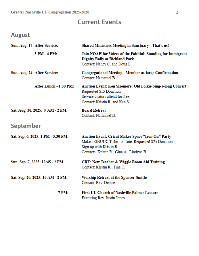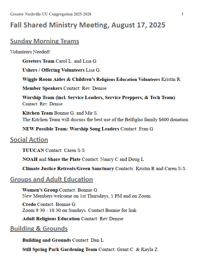 On August 17, 2025, we had a Shared Ministries meeting after service to talk about volunteer opportunities, covenant groups, and upcoming events.