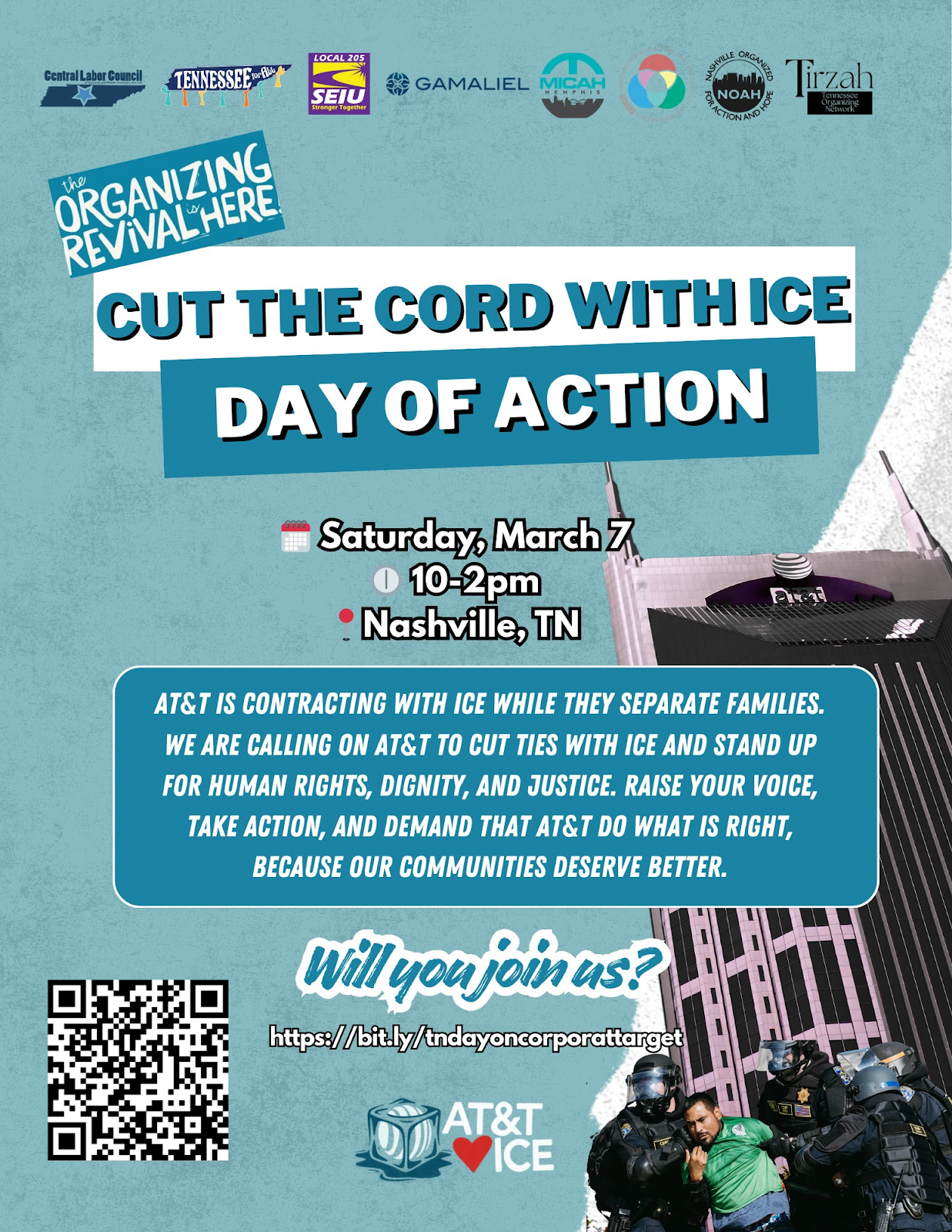 The following day, on Saturday, March 7th, from 10 am to 2pm, we will be using what we learned and calling for Nashville to boycott AT&T, who have a multi-million dollar contract with ICE, supporting their telecommunications as they kidnap our neighbors and tear apart families.