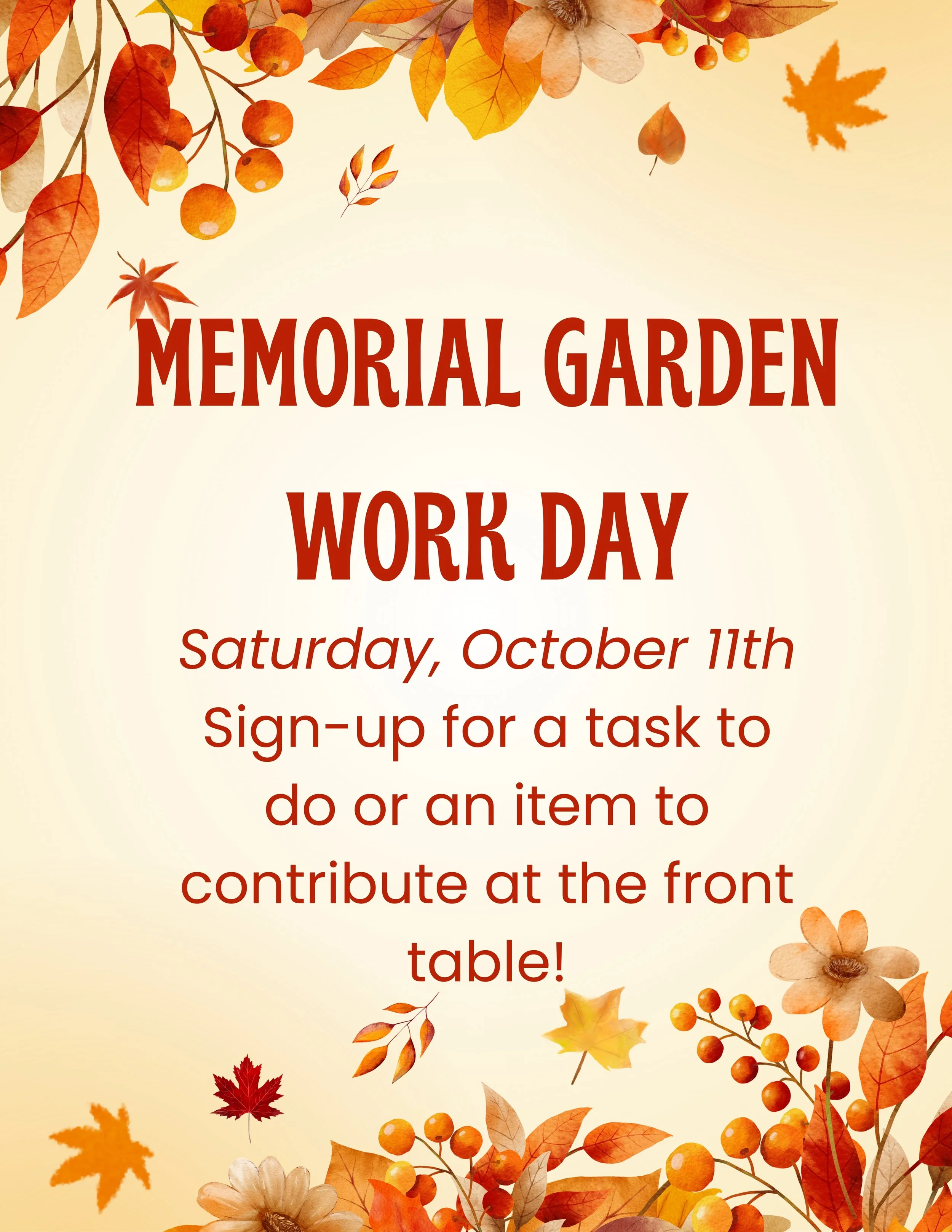 On Saturday, October 11th at 10AM, we will do some work on the Memorial Garden area. Please sign up for a task and/or an item contribution at the front desk by October 5th. We should wrap up work by 1PM.